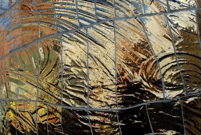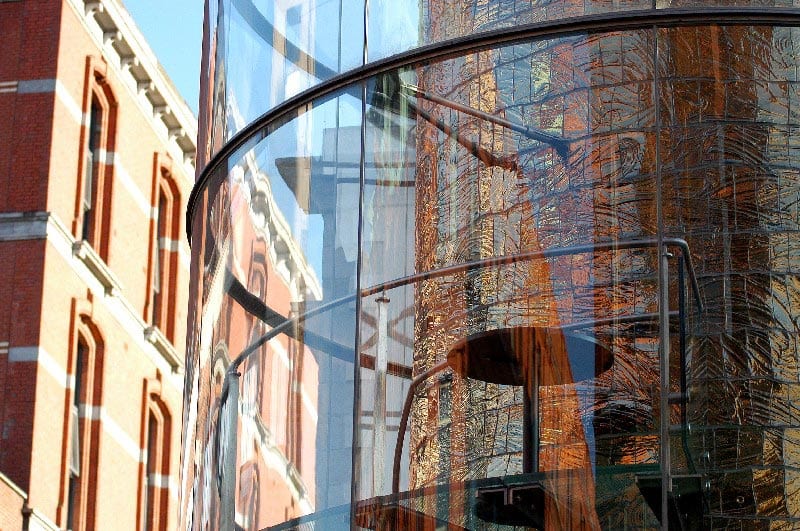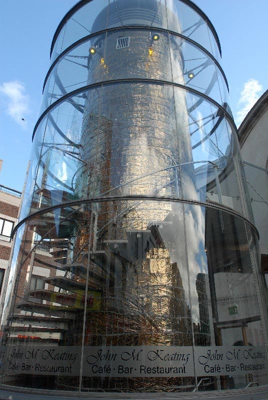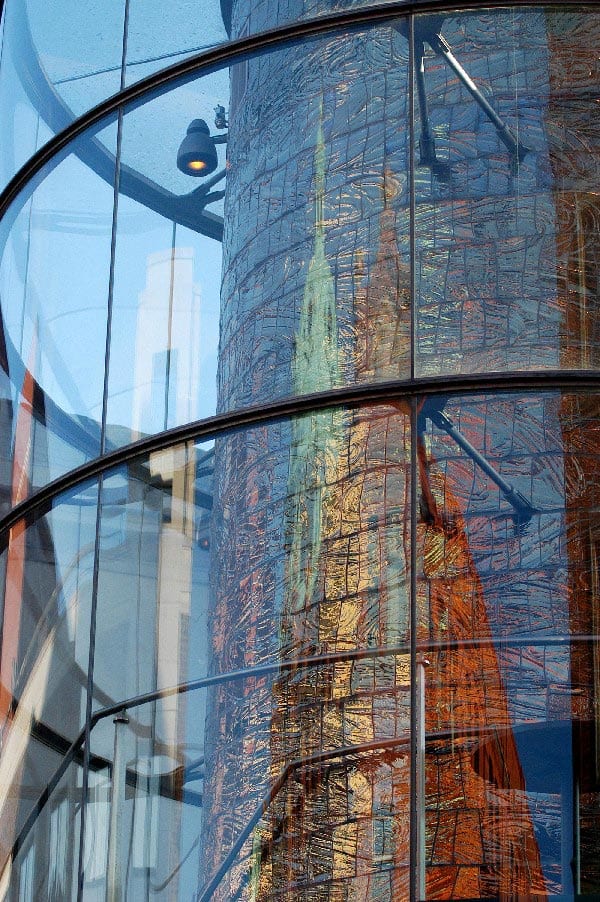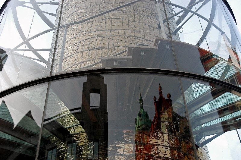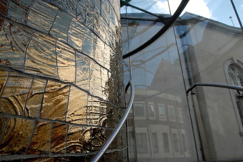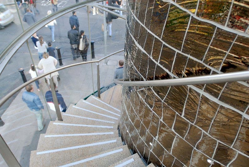 Laura was inspired by the underground water that is continually flowing beneath the city. She raised the water up the tower and it now reflects the surrounding buildings in its soft gold glaze.
